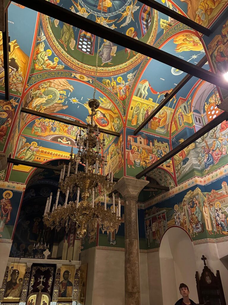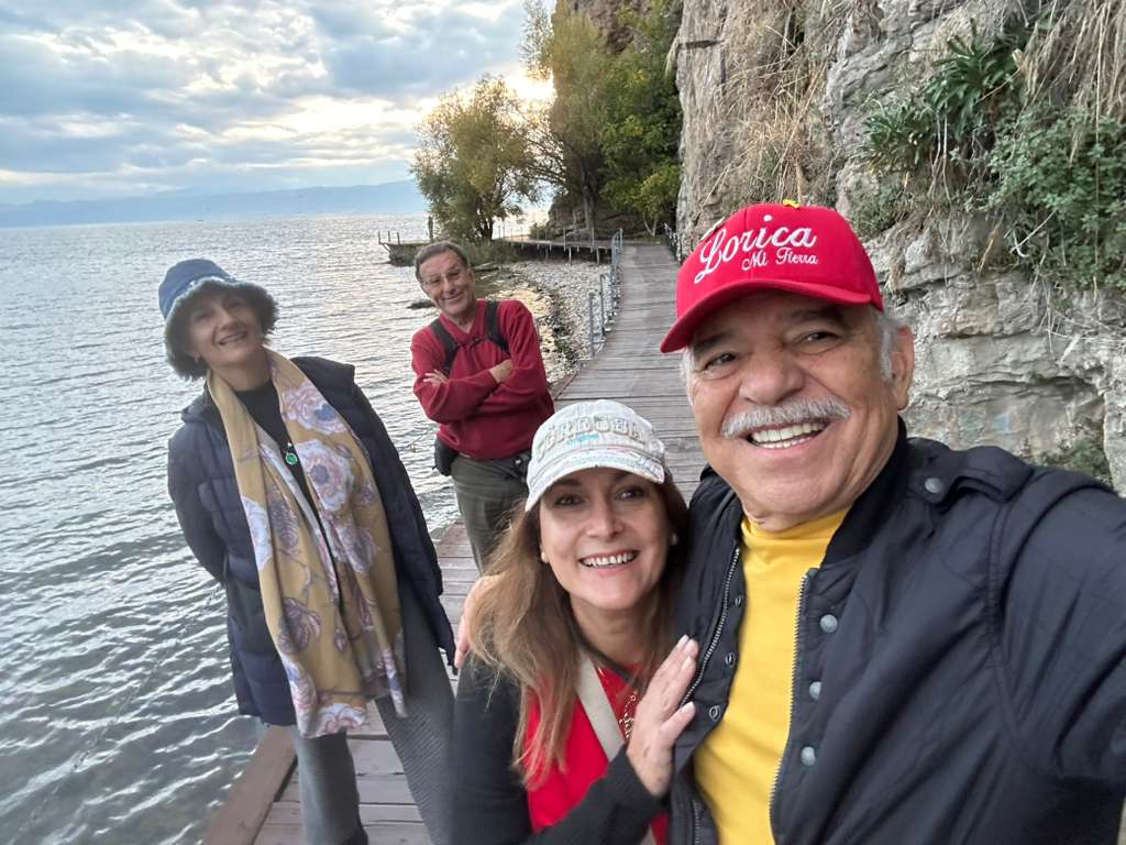 Compartimos un trago de rakija, y lo animé a mirar la vida con alegría, a celebrar la belleza que lo rodea. Pasamos frente a la iglesia de San Jovan Kaneo, suspendida sobre un acantilado, y seguimos hacia Zaum, la bahía-museo donde se reconstruyen los palafitos de antiguas aldeas lacustres. Finalmente llegamos al monasterio de San Naum, un santuario donde los manantiales brotan de las entrañas de la tierra y los pavos reales caminan entre los cipreses.