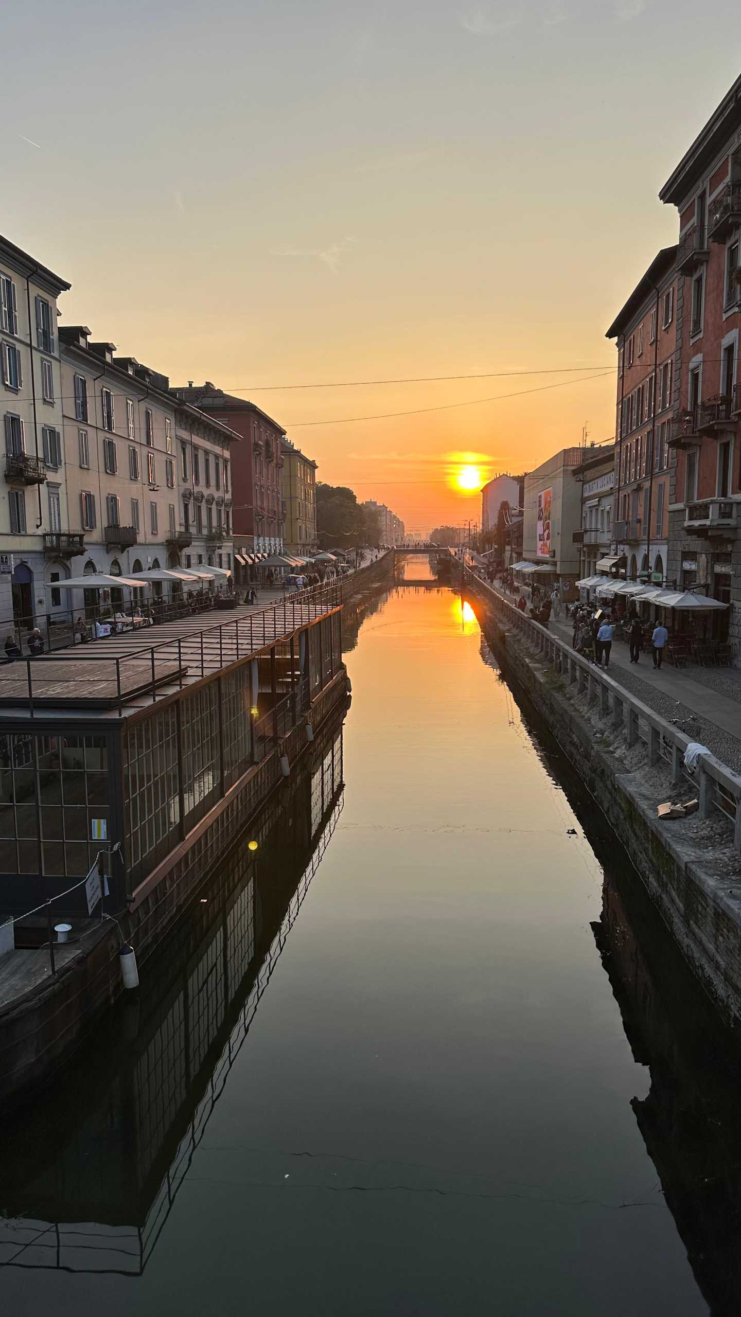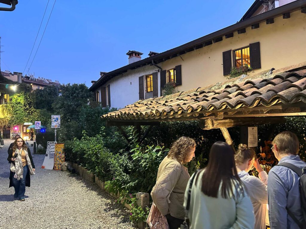 Anoche paseamos por Navigli, el barrio de los canales ideado por Leonardo da Vinci en el siglo XV para conectar el Ticino con el Adda. Hoy sus aguas reflejan faroles y risas, terrazas llenas y el bullicio de los jóvenes que se entregan al aperitivo milanese. Allí cenamos en una trattoria recomendada por la milanesa Eliana Bresolin, quien nos habló de su infancia entre las vías del tranvía 3 y los aromas de ossobuco y risotto alla milanese. Pedimos pasta fresca, vino lombardo y dejamos que la noche corriera despacio, como el agua que fluye bajo los puentes de Navigli.