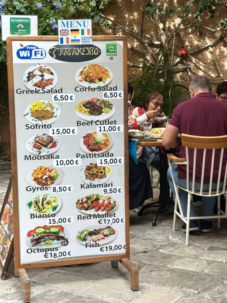 En las calles del casco antiguo, los balcones se cubren de buganvilias, y las mujeres, con pañuelos de seda, venden aceite de oliva y pasteles de almendra. En la taberna To Gato Negro, donde nos detuvimos a almorzar, el dueño, Spyros, nos sirvió pastitsada —guiso de carne con vino y especias—, sofrito —ternera con ajo y perejil—, bourdeto —pescado con salsa picante— y tsigareli, acelgas salteadas con pimienta. La comida griega, sencilla y sabia, tiene el sabor de la tierra y del mar.