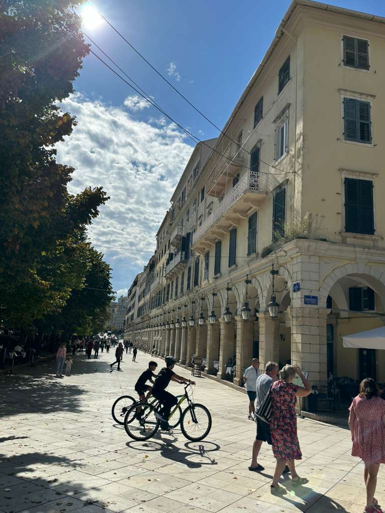 Kérkira —como llaman los locales a Corfú— es la isla más septentrional del mar Jónico. A la vista de Albania, pertenece a Grecia pero mira hacia Italia; su historia es un mapa de dominaciones: veneciana durante cuatro siglos, napoleónica por breve tiempo, británica hasta 1864, cuando se integró definitivamente al reino helénico. Esa mezcla se percibe en su arquitectura: balcones de hierro forjado, arcadas francesas, plazas inglesas y callejones que huelen a pan y azahares.